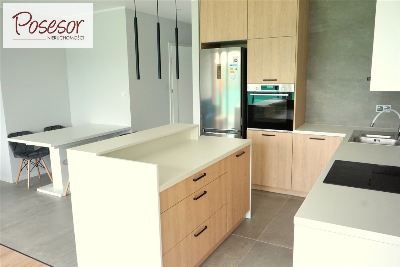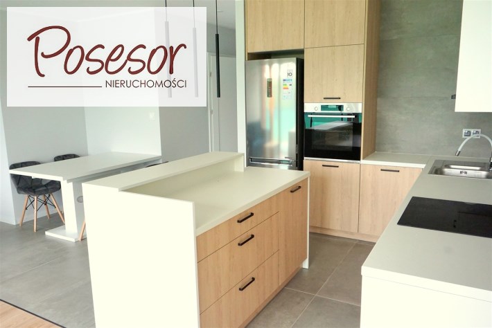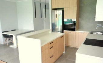 - kuchnia wykonana na wymiar, wyposażona w lodówko-zamrażarkę, zmywarkę, piekarnik oraz płytę grzewczą