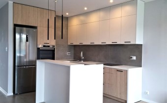 - kuchnia wykonana na wymiar, wyposażona w lodówko-zamrażarkę, zmywarkę, piekarnik oraz płytę grzewczą